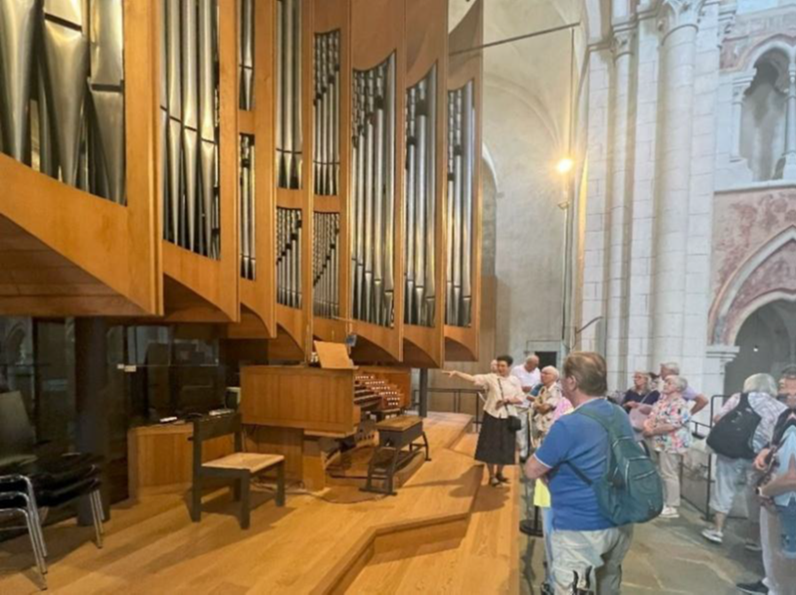 Schließlich machten wir uns am Sonntag wieder auf den Heimweg. Als letzte Station in Saarbrücken besuchten wir noch den Halberg, heute Sitz des Saarländischen Rundfunks. Hier ist aber auch das Grab des letzten Fürsten von Nassau-Saarbrücken. Am Hang befinden sich die Überreste eines Mithras-Tempels, wobei die Wanderung dahin für viele Teilnehmer sicher anspruchsvoll war. Abschluss und sicher für viele Teilnehmer auch Höhepunkt der Rundreise war Kirchheimbolanden. Wie Usingen hat auch Kirchheimbolanden sein Schloss verloren, aber den Schlosspark und zahlreiche brocke Kavaliershäuser erhalten. Viele Fachwerkhäuser und eine teilweise rekonstruierte Stadtmauer machen den Reiz des Städtchens aus. Am meisten wird aber den Teilnehmern der Gesang bei der kleinen Weinprobe und das Orgelkonzert auf der Mozartorgel in der Paulskirche in Erinnerung bleiben. In jedem Fall haben alle Mitfahrenden viel über die Nassauer, ihre verschiedenen Linien und Residenzen gelernt und vier wunderbare Tage erlebt.