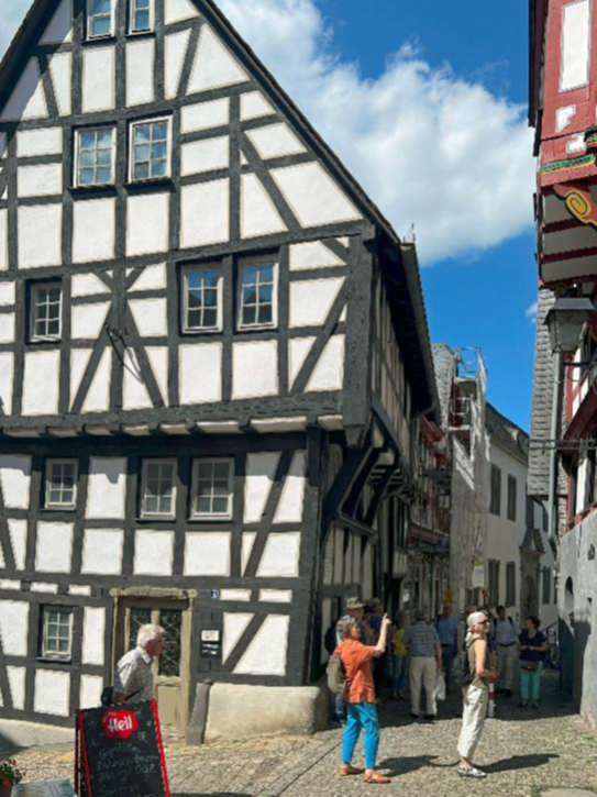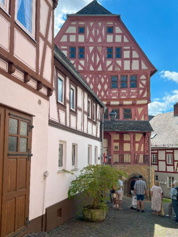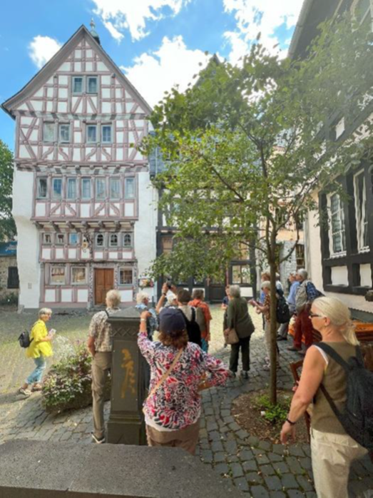 Renate Englisch, Mitglied des Geschichts- und Kulturkreises Oberstedten, Großnichte der bekannten Oberstedter Wirtin „Tante Anna“ und heute wohnhaft bei Limburg, führte eine größere Gruppe zu markanten Häusern in den Altstadtgässchen und erläuterte die Geschichte der Fachwerkbauten. Dabei konnte sie ihr umfassendes Fachwissen über die Besonderheiten der Häuser vermitteln.