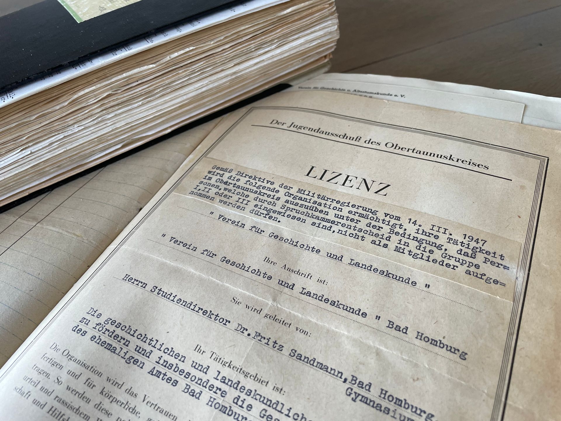 Als wichtige Konstante in der Geschichte des Vereins hob die Referentin die enge Zusammenarbeit mit dem Bad Homburger Stadtarchiv hervor. In diesem Sinne hatte Gregor Maier, der aktuelle Vorsitzende des Vereins, am Ende noch eine Überraschung parat: Als Dank für die gute Zusammenarbeit überreichte er dem Stadtarchiv zwei Protokollbände des Geschichtsvereins, in denen die Vereinsarbeit der Jahre 1935 bis 1982 dokumentiert ist. Vor allem die Zeit des Nationalsozialismus, in der auch der Geschichtsverein gleichgeschaltet unter einem „Vereinsführer“ agierte, und der Neuanfang nach 1945, aber auch die Modernisierung der Themen und Zugänge seit den 1950er- und 1960er-Jahren lassen sich darin anschaulich nachvollziehen. Damit wird die Reihe der Protokollbände, die bisher bereits für die Jahre 1891 bis 1934 im Stadtarchiv verwahrt werden, nahtlos fortgesetzt. Auch die neuere Vereinsgeschichte ist damit jetzt im Stadtarchiv dokumentiert und steht der Wissenschaft wie der Öffentlichkeit zur Verfügung.