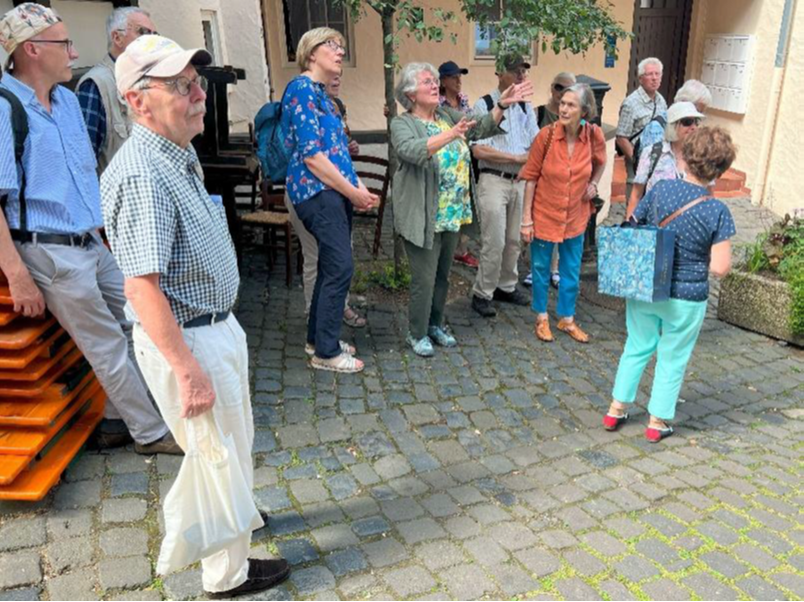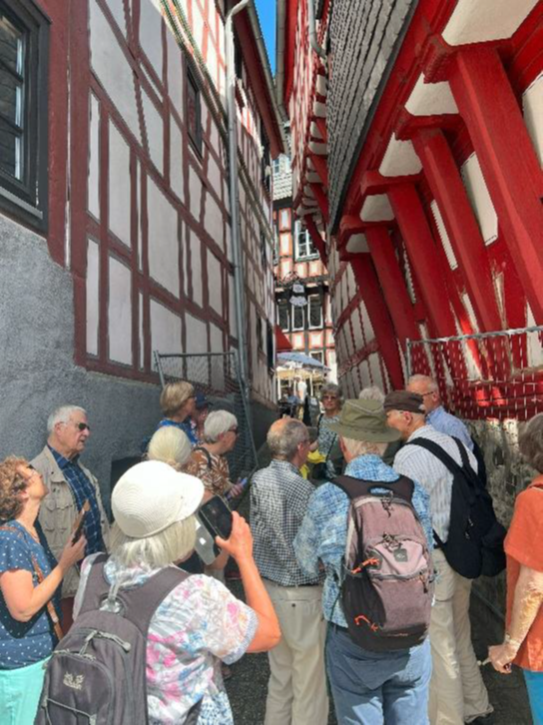 Renate Englisch, Mitglied des Geschichts- und Kulturkreises Oberstedten, Großnichte der bekannten Oberstedter Wirtin „Tante Anna“ und heute wohnhaft bei Limburg, führte eine größere Gruppe zu markanten Häusern in den Altstadtgässchen und erläuterte die Geschichte der Fachwerkbauten. Dabei konnte sie ihr umfassendes Fachwissen über die Besonderheiten der Häuser vermitteln.