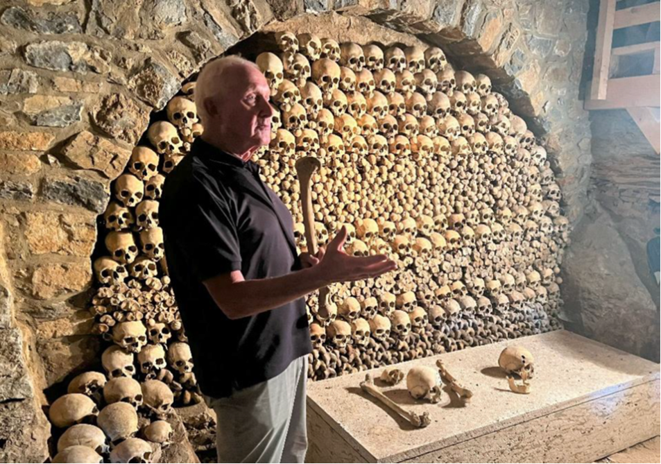 Schade, dass nicht mehr Zeit zur Verfügung stand, denn einige bohrten hartnäckig nach. Bei genügend Zeit hätte Bernhard Eufinger für die Gruppe sicher zwei Fläschchen für eine Verköstigung herausgerückt und dabei noch manche Geschichte erzählen können. Doch so führte der Weg abschließend in den tiefen Untergrund unter der Basilika, in den sogenannten „Karner“, der noch unter der tief liegenden Michaelskapelle im Kalksteinfelsen liegt. Eine sehr enge und niedrige Felsentreppe führte in das Gebeinhaus. Nur tief gebückt und ohne klaustrophobische Ängste war der Raum über Felsstufen zu erreichen. Hier waren unzählige Schädel und Knochen aus früheren Gräbern aufgeschichtet, die bei Bauarbeiten um die Kirche gefunden wurden. Das Gelände um die Basilika war nämlich früher der zentrale Bestattungsort der Region.